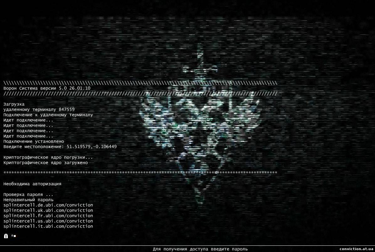Сайт Splinter Cell обновился, теперь для доступа на сайт нужно ввести пароль, если пароль указан правильно, вы попадете на сайт где сможете узнать много новой информации, а также узнаете подробности о таинственной организации «Ворон» Подсказка к паролю кроется на этой странице, если же профессия шпиона не для вас пишите мне в ЛС, ответив на мой секретный вопрос вы получите пароль, также слева в меню появилась кнопка «Ворон», там будет та же информация что и на офф. сайте, только уже без пароля, и без такого красивого оформления как на сайте «Ворон».